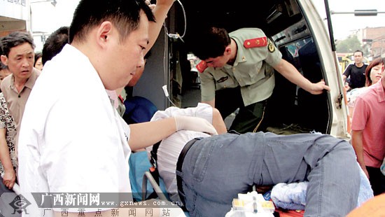 当南宁市第三人民医院的救护车来到时,消防队员协助医生将蓝伯抬到担架上。随后,蓝伯进入医院接受治疗。医生将铁管从蓝伯大腿处取出后,进行治疗。(宋甲子)