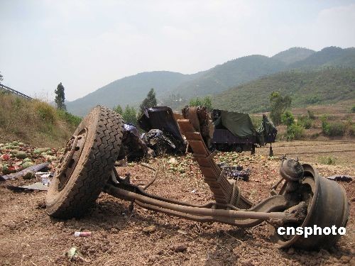 25日6时40分许,在云南楚雄彝族自治州昆楚公路127公里处发生一起特大交通事故,一辆旅游客车与货车相撞,目前已导致20人死亡,21人受伤。图为车祸现场已经分离的货车车体。中新社发 徐向良 摄