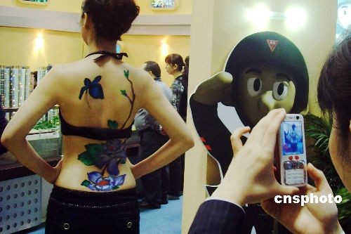 4月26日,在重庆房交会现场,一位美女现场展示人体彩绘,吸引市民驻足观看。中新社发 孟幻 摄