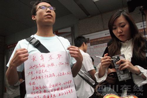想找份好工作,就要学会推销自己。昨(26)日上午,成都市人才市场门口出现了让人目瞪口呆的一幕:一名25岁的小伙子身挂“求职”招牌,寻求一份年薪10万元的工作。如此推销自己,他也坦然承认:我就是在包装自己而已。