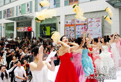 昨日(26日),武昌某商场广场前,10对甜蜜爱人和他们的亲友一起用音乐见证最完美的爱情。活动现场,他们用唱歌的方式将自己从相识、相知、相爱的爱情历程一一演绎,现场气氛热烈,吸引了众多观众驻足围观。图为十名新娘将象征爱情的花球抛向现场的单身男女。