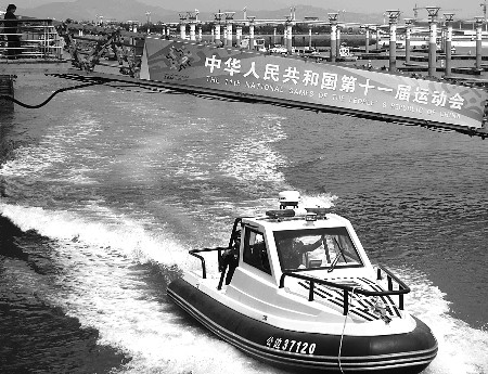 4月27日,8艘曾参加北京奥帆赛安保工作的巡逻艇从青岛运抵日照,开始执行“十一运”日照赛区的水上项目安保任务。图为日照边防支队官兵驾驶巡逻艇了解赛区水域情况。韩延璟 栾一英 车明 摄影报道
