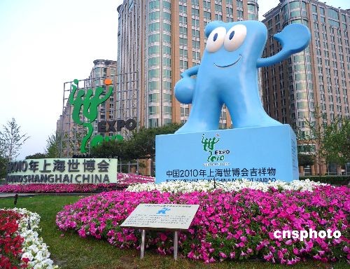 2009年4月28日,上海世博会吉祥物“海宝”花坛整体亮相北京东单路口处,迎接世博会倒计时一周年的到来,可爱的“海宝”吸引了过往行人的目光。2010年上海世博会吉祥物“海宝(HAIBAO)”,意为“四海之宝”,以蓝色汉字的“人”作为核心创意,既反映了中国文化的特色,又呼应了上海世博会会徽的设计理念。中新社发 玉龙 摄