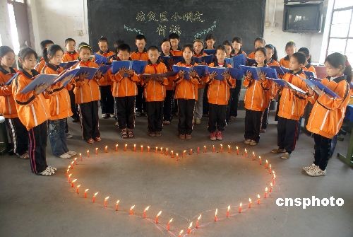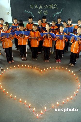 4月29日,河南省济源市纸坊小学学生点燃红蜡烛为四川地震灾区小朋友祈福。在汶川地震一周年即将来临之际,河南省济源市纸坊小学举行“为灾区小朋友祈福”主题班会,大家点燃红蜡烛,献上饱含深情的诗歌,为四川地震灾区小朋友祈福平安。中新社发 平白 摄