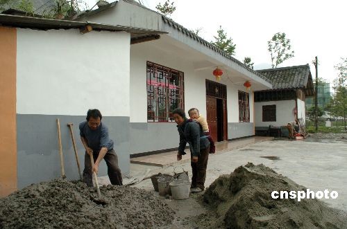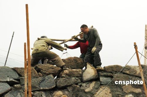 四月二十九日,四川省汶川漩口镇油碾村村民在修筑防山体滑坡墙重建家园。该村在去年地震灾害中受灾严重,一百一十四个农户急需建住房,该村“侨心居”项目由广东省中山市对口援建,目前该村农户的住房重建已经全部规划完毕,重建工作正有序进行。中新社发 罗仰明 摄