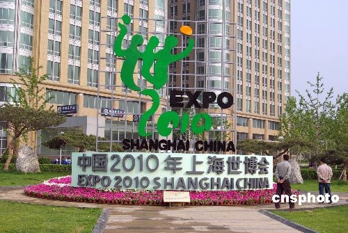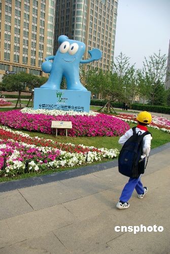 4月29日,中国2010年上海世博会吉祥物“海宝”和会徽花坛亮相北京长安街。2010年上海世博会吉祥物“海宝(HAIBAO)”,意为“四海之宝”,以蓝色汉字的“人”作为核心创意。会徽图案以中国汉字“世”字书法创意为形,表达世博会“理解、沟通、欢聚、合作”的理念。中新社发 九州 摄