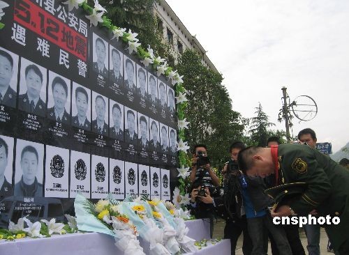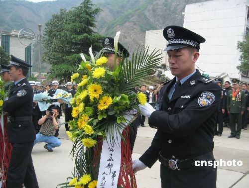 5月1日,公安部“我最喜爱的十大人民警察”先进事迹报告团成员前往四川省北川羌族自治县老县城遗址,祭奠在去年“512”汶川大地震中遇难的北川县28位警察。中新社发 肖青 摄