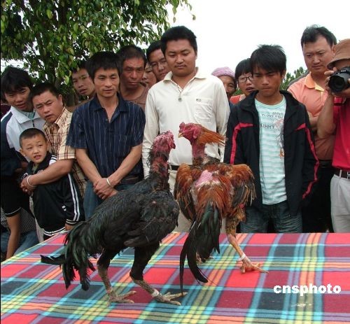 5月2日,斗鸡比赛在云南墨江县通关镇举行,此次活动成为当地正在举办第五届中国·墨江北回归线双胞节暨哈尼太阳节期间的又一亮点,有来自云南玉溪、普洱、西双版纳等地的100余只斗鸡参加比赛。近年来,墨江县挖掘哈尼文化中传统竞技项目过程中,斗鸡逐渐成为哈尼族民间深受群众喜爱的娱乐活动。图为斗鸡冠军争夺赛。中新社发 徐向良 摄