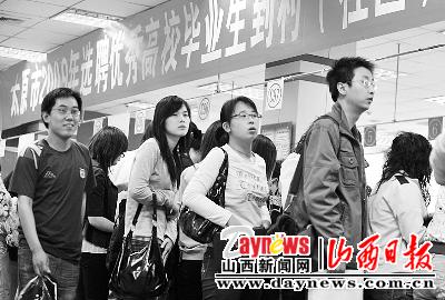 5月4日,在太原市人才大市场,大学生正在等候报名应聘 “村官”。当日,太原市第四批选聘优秀大学毕业生到社区和乡村任职报名开始,300个“村官”的岗位吸引了近万名大学生前来报名。