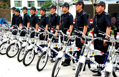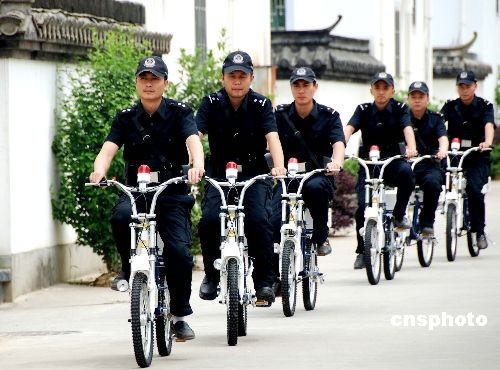 5月5日,江西婺源的大街小巷的城区出现了一支特警自行车治安巡逻队。他们骑乘统一配发的轻便自行车,车前挂有“巡警110”标志,车后配备便民服务箱。为群防群治,共织平安网,婺源县公安局特警大队由60人组成的一个特色 “警务自行车巡逻队”,以适应该县辖内小街巷多、警车巡逻不易覆盖的治安特点。同时利用自行车巡逻既环保、便捷、无噪音,又可增加古城小道的见警率,还避免了机动车频繁流动造成的道路拥堵, 大大提高“走街串巷”治安巡防的效率,延伸了公安机关对社会面的防控触角。 中新社发 王国红 摄