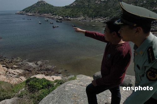 5月6日,南麂边防派出所官兵在海边观察赤潮污染情况。 中国首批五个国家级海洋类型自然保护区之一的浙江省平阳县南麂列岛海域从5月2日起发生赤潮现象,目前开始有所消退。发现赤潮后,南麂边防派出所官兵迅速出动,向当地渔民群众宣传有关防范知识,并提醒水产养殖户做好各项预防措施。中新社发 吴水斌 摄