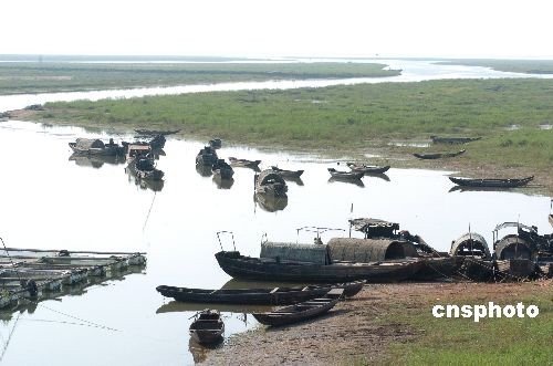 5月7日,进入汛期的鄱阳湖进贤县三里乡水域现出罕见低水位。虽然进入了汛期,但中国第一大淡水湖鄱阳湖仍然没“喝饱”水。由于08年以来的干旱导致周边水库和河流存水大幅度减少,河流水库“底气”不足,09年前4个月鄱阳湖的入湖水量减少了一半以上,加之1月至5月上旬,降水量偏少,导致鄱阳湖部分区域出现低水位现象。中新社发 朱文标 摄