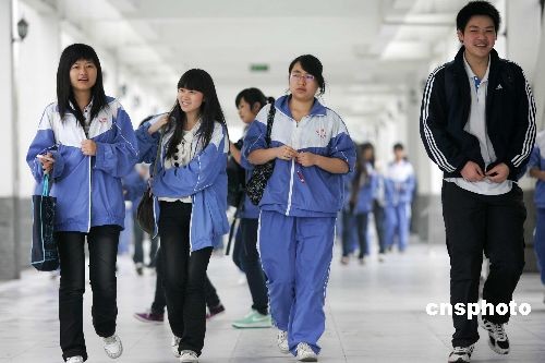 5月8日,都江堰中学高三学生进行了高考前的第三次模拟考试,备战高考。这是都江堰在5.12震后开学的第一所永久性学校。中新社发 富田 摄