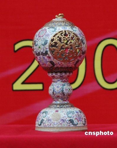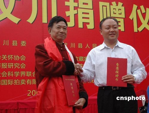 5月10日,四川省收藏文化研究会常务副会长伍义江在汶川县漩口镇,实现了为汶川地震灾区尽一分心意的夙愿:将自己珍藏十余年的文物“花薰冠架”无偿捐给汶川县,以拍卖所得支援灾区重建。专家称该文物价值逾亿元人民币。 中新社发 肖龙联 摄