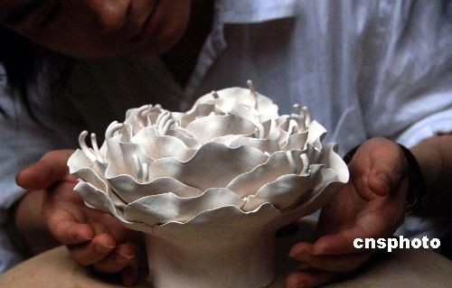 一年前在汶川大地震中失去生命的双胞胎女孩琦琦和佳佳,在5月10日母亲节当天,用她们的骨灰塑造成的“生命之花”在中国陶都广东石湾的民窑出窑绽放,制作人舒勇表示“生命之花”是献给在汶川大地震中失去孩子的母亲们的礼物。中新社发 梁永强 摄