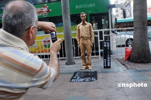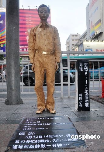 5月11日,一位全身刷着“古铜”色的小伙站在深圳市华强北街头,号召市民民12日14:28分为地震遇难者默哀,小伙前面地上的一块小黑板上用用白色广告油写着一份倡议:5月12日14时28分,停下我们匆忙的脚步,为5.12地震遇难同胞静默一分钟……中新社发 吕雪良 摄