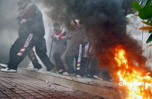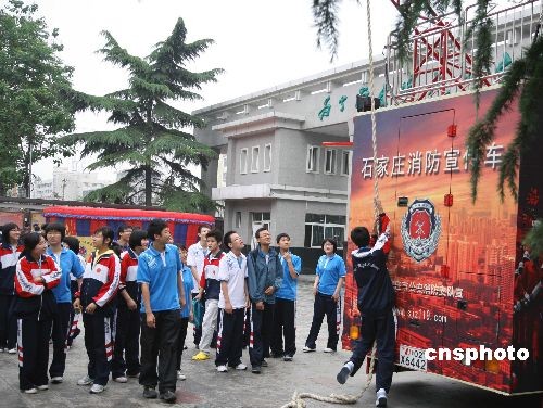 5月12日是中国为纪念汶川大地震一周年而设立的“防灾减灾日”。河北省公安消防总队为某中学师生带来防灾减灾相关知识的同时,还进行了火灾逃生的现场演练。中新社发 翟羽佳 摄