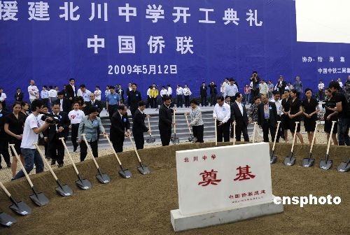 五月十二日,中国国侨办主任李海峰和中国侨联主席林军等,一同在四川省北川县出席援建北川中学奠基仪式。北川中学新址在北川新县城建设区域内。中新社发 廖攀 摄