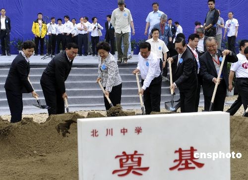 五月十二日,中国国侨办主任李海峰和中国侨联主席林军等,一同在四川省北川县出席援建北川中学奠基仪式。北川中学新址在北川新县城建设区域内。中新社发 廖攀 摄