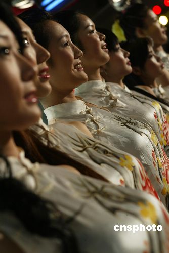 2006年7月22日,第56届世界小姐中国区总决赛佳丽首次记者见面会在北京市怀柔区举行。图为参赛佳丽们集体出场亮相。中新社发 杨可佳 摄