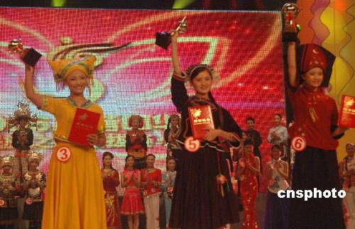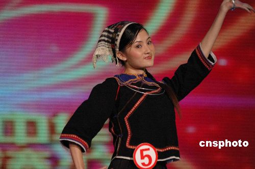 七月二十五日晚,首届中国民族之花选拔活动广西赛区总决赛在广西电视台演播大厅举行,四十五名来自全区各地,分别代表壮、瑶、苗、侗、仫佬、毛南、京、汉八个民族的佳丽在同一舞台上展示了各自的民族风采。经过角逐,参赛的各个民族选手的前三名被选为广西赛区“民族之花”。中新社发 蒋雪林 摄