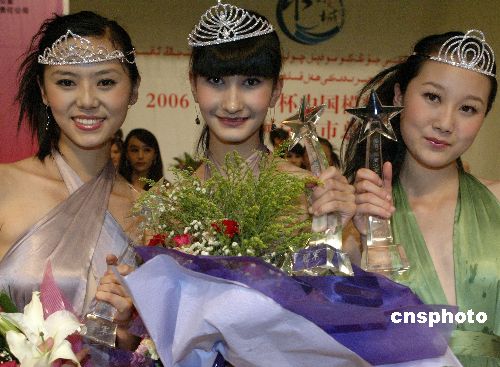 7月30日晚,在新疆阿克苏市举行的2006“多浪杯”中国模特之星新疆总决赛上,同时进行的“中国美少女模特大赛新疆总决赛”经角逐后产生冠、亚、季军,来自乌鲁木齐市的维吾尔族选手古菲娅·帕尔哈提(中)获得冠军、刘思佳(右)获得亚军、黄蓉获得季军。中新社发 钱兴强 摄