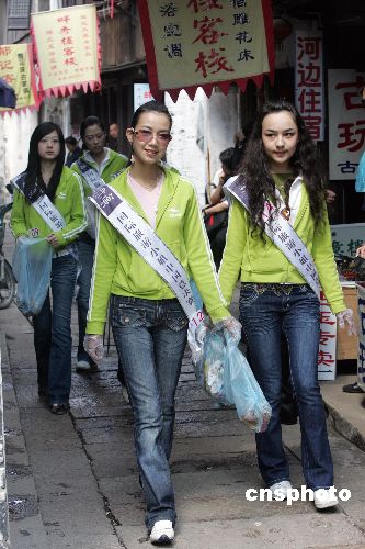 二零零七年国际旅游小姐大赛中国区总决赛选手四月十八日在浙江古镇西塘参加环境保护日活动,佳丽们在街头拣拾垃圾并向人们发放传单,以广泛宣扬环境保护意识,更好地保护千年古镇风貌。中新社发 毛建军 摄