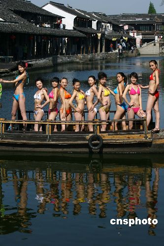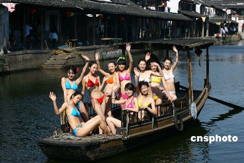 四月十九日,浙江水乡古镇西塘阳光明媚,参加二零零七年国际旅游小姐大赛中国区总决赛的佳丽,身着比基尼乘船做秀,给千年古镇平添现代时尚气息。中新社发 毛建军 摄
