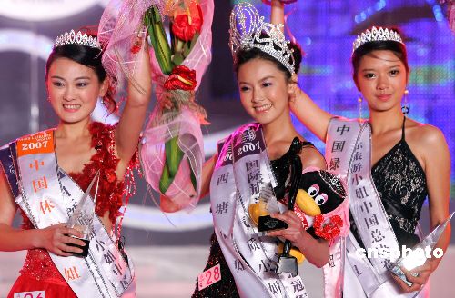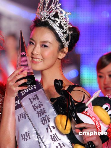 四月二十四日晚,二○○七年国际旅游小姐大赛中国总决赛在浙江古镇西塘举行。来自新疆的美少女马炜最终获得中国赛区总冠军,她将代表中国参加于今年六月举行的二○○七年国际旅游小姐全球总决赛。中新社发 汤彦俊 摄