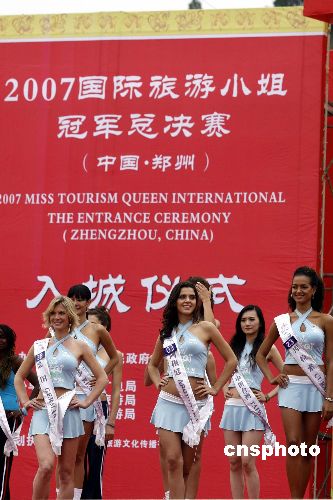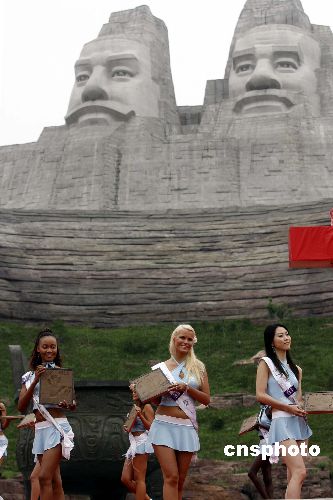 七月二十日,一百零八位佳丽在郑州黄河风景名胜区炎黄广场参加“2007国际旅游小姐冠军总决赛入城仪式”。仪式上,中原汉子敲响炎黄广场大钟,擂响六十六面大鼓,四十人用唢呐吹奏“百鸟朝凤”乐曲,并有太极方队表演,彰显中原文化神韵,最后万人高唱《龙的传人》。中新社发 慎重 摄