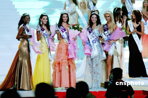 2007年7月31日晚间,2007国际旅游小姐冠军总决赛在郑州会展中心举行。经过激烈角逐,俄罗斯、泰国和费尔南多·迪诺罗尼亚小姐获得冠、亚、季军,中国小姐获最佳微笑奖。图为获得总决赛前五名的佳丽集体亮相。中新社发 马健 摄