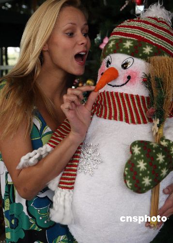 12月4日晚,正在广东深圳参加第34届国际比基尼小姐大赛的各国佳丽,来到湾区会馆参加公益活动。图为一名佳丽在会馆布置的圣诞雪人前拍照。中新社发 钱兴强 摄