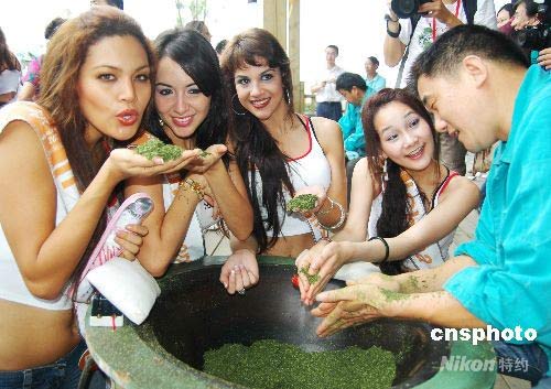 2008年6月23日,刚刚拉开帷幕的2008苏州相城中国珍珠节暨世界休闲小姐总决赛迎来了巡游活动,来自世界75个国家和地区的众多选手们来到苏州家具城、荷塘月色景区和珍珠城,学习茶道,采集河蚌、剖蚌取珠、观赏荷花、选购珍珠饰品等,佳丽们所到处都吸引了众多市民围观和合影。苏州相城区推出的“江南风情游”,让佳丽们感受到了无穷乐趣。中新社发 朱子寒 摄