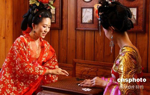“国庆黄金周”之际,2008世界亚裔小姐大赛系列活动在北京进行展示,赛事活动以中国文化和中国元素为表现主题,演绎“唐风宋雅”女性风采,通过展示中国盛唐时期的服饰美和造型美,从一个侧面反映中国女性“浸于史、润于知、融于德、成于韵”的独特气质与内涵,选手盛装出境,在中国古典家具的映衬下,分别从琴、棋、书、画四个方面完美演绎了一幅幅颇具文化气息的传统仕女生活图。中新社发 钱兴强 摄