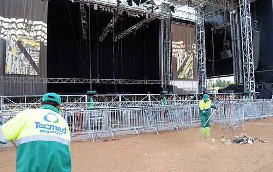 在摩洛哥首都拉巴特一个音乐会现场,两名工作人员清理残留的垃圾。