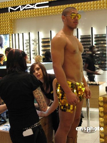 在伦敦牛津街著名的selfridges商场某化妆品柜台,化妆师正在将金属贴片粘在男模身上,做成一个内裤。金融危机之下,这家拥有英国最大、享誉欧洲的化妆品部门的商场,正以更时尚前卫的促销手段吸引眼球。中新社发 魏群 摄