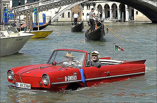 近日,柏林水陆两用车俱乐部的贝恩德·魏瑟驾驶着自己的水陆两用车在意大利威尼斯的大运河中行进。这款德国制造的水陆两用车在陆地上的行驶速度可以达到110公里/时,而在水中的行驶速度则可以达到8节。驾驶水陆两用车的司机必须拥有汽车和船的驾驶执照。