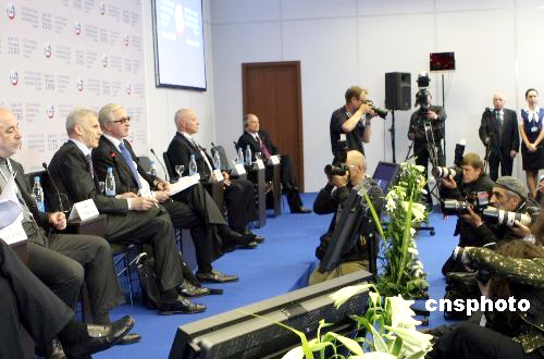 6月4日,“2009圣彼得堡国际经济论坛”召开,俄罗斯与美国就两国关系“重启”条件下,如何加强两国经济领域合作、以及俄罗斯加入WTO等问题展开对话。俄罗斯工业与企业家联合会主席绍欣与美国贸易代表柯克等众多俄美工商企业界巨头与会。 中新社发 田冰 摄