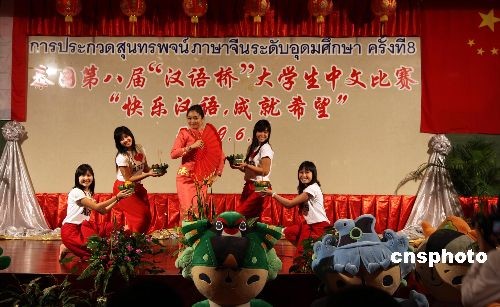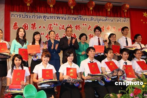 6月6日,由中国驻泰国大使馆和泰国教育部高等教育委员会联合举办的泰国第八届“汉语桥”大学生中文比赛在曼谷城市酒店举行。选拔自泰国朱拉隆功大学、法政大学、皇太后大学等19所精英大学的19名选手用地道的汉语阐述了“快乐汉语,成就希望”的大赛主题,表达了泰国大学生对中国的期盼与祝福。经过4个多小时紧张激烈的比赛,由中泰双方汉语专家组成的大赛评委会评出了一等奖2名、二等奖4名、三等奖6名、积极参与奖7名、优秀组织奖2所大学。当日获得一等奖的来自博仁大学的董诗碧和易三仓大学的江振茂两位同学,将代表泰国到中国参加全球决赛,其他选手也获得了到中国进参加秋令营的奖学金。中新社发 顾时宏 摄