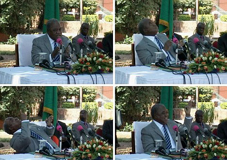 据英国媒体报道,赞比亚总统鲁皮亚·班达25日在总统府外举行的一个新闻发布会上向记者发表讲话时,一只在树上玩耍的猴子在他身上撒尿。