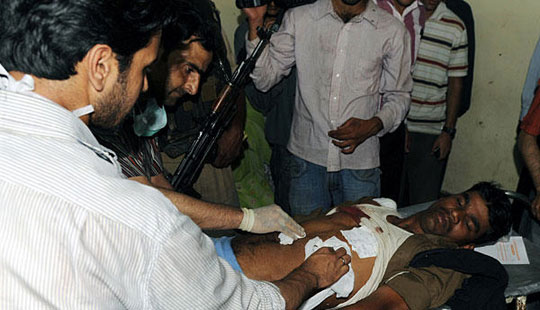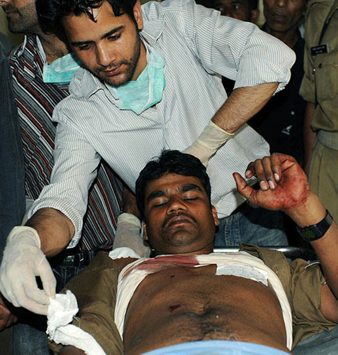 6月27日,在印控克什米尔地区的斯利那加,印度士兵遭到武装分子投掷手榴弹袭击,3名士兵受伤。图为医护人员在救治受伤的士兵。