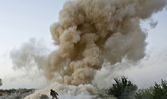 7月13日,在阿富汗南部的赫尔曼德省,一名美军士兵躲避爆炸。当天,美军士兵在前往塔利班在赫尔曼德省的据点的路上遇到爆炸,两名美军士兵身亡。