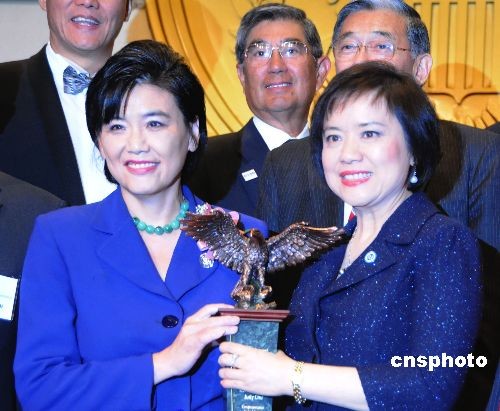 七月二十三日晚,国际领袖基金会在华盛顿举行颁奖晚会,奖励杰出的亚裔人士,在美国国会中仅有的两名华裔议员吴振伟、赵美心分别获得“年度杰出公职服务奖”。图为美国“国际领袖基金会”执行长、曾任美国商务部少数族裔发展署副署长兼幕僚长的华裔政界名媛董继玲(右),向美国华裔女众议员赵美心颁奖。国际领袖基金会为全美最著名的亚裔青年领袖训练机构,每年定期表扬促进国际经贸繁荣、发扬中华文化传承有卓越成就的杰出人士。中新社发 吴庆才 摄