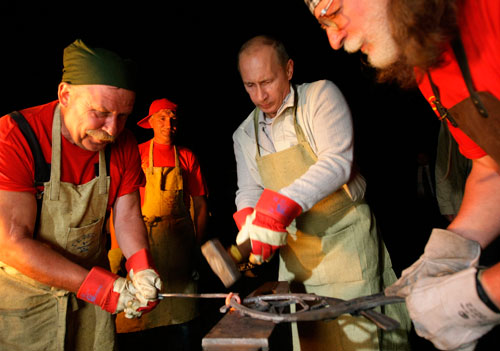 8月1日,俄罗斯总理普京在访问伊尔库茨克地区的“塔尔茨建筑和民族博物馆”时挥动锤头“练习”打铁。