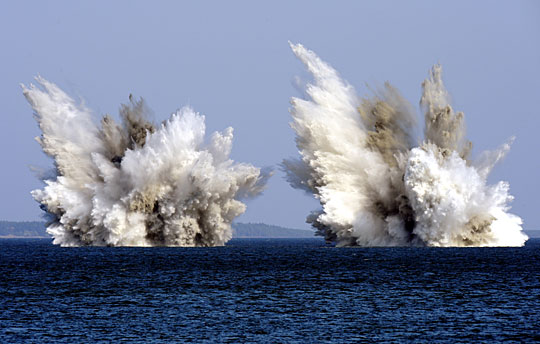9月9日,爱沙尼亚首都塔林附近发现了约64枚二战时期的水雷。该国军方成功将其引爆,图为水雷爆炸瞬间。