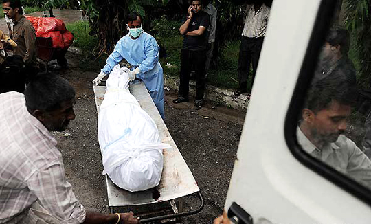 图为医护人员和家属将一名死于踩踏事件的学生的尸体运上救护车。
