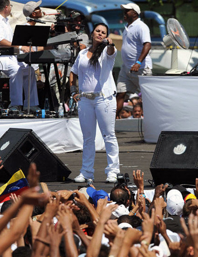 图为波多黎各歌手奥尔加·塔农在大型露天音乐会上演唱。