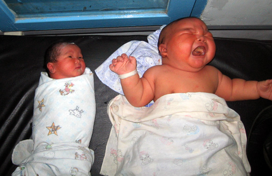 9月23日,印尼一名女子日前产下一个体长62厘米,重8.7公斤的巨型男婴(图右)。当地医生称,该新生儿于当地时间9月21日在北苏门答腊一个公立医院通过剖腹产出生,并打破了印尼的历史记录。