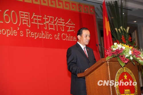 二十七日晚的曼谷皇后花园酒店灯火辉煌,冠盖云集,来自泰国政界、军界以及泰华社会华人华侨等各界人士一千多人欢聚一堂,共同举杯庆祝由中国驻泰国大使馆举办的庆祝中华人民共和国成立六十周年国庆招待会。图为中国驻泰大使管木在招待会上致词。中新社发 顾时宏 摄