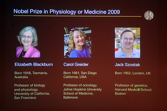 北京时间10月5日下午17时30分,2009年度诺贝尔生理学或医学奖在瑞典卡罗林斯卡医学院揭晓,三位美国科学家伊丽莎白•布兰克波恩(Elizabeth H. Blackburn)、卡罗尔•格雷德(Carol W. Greider)以及杰克•绍斯塔克(Jack W. Szostak),因发现由染色体根冠制造的端粒酶(telomerase),这种染色体的自然脱落物将引发衰老和癌症而共同获得该奖项。